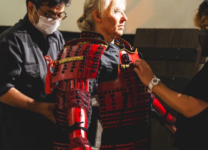 ①ご予約時にあらかじめお選びいただいた甲冑を装着